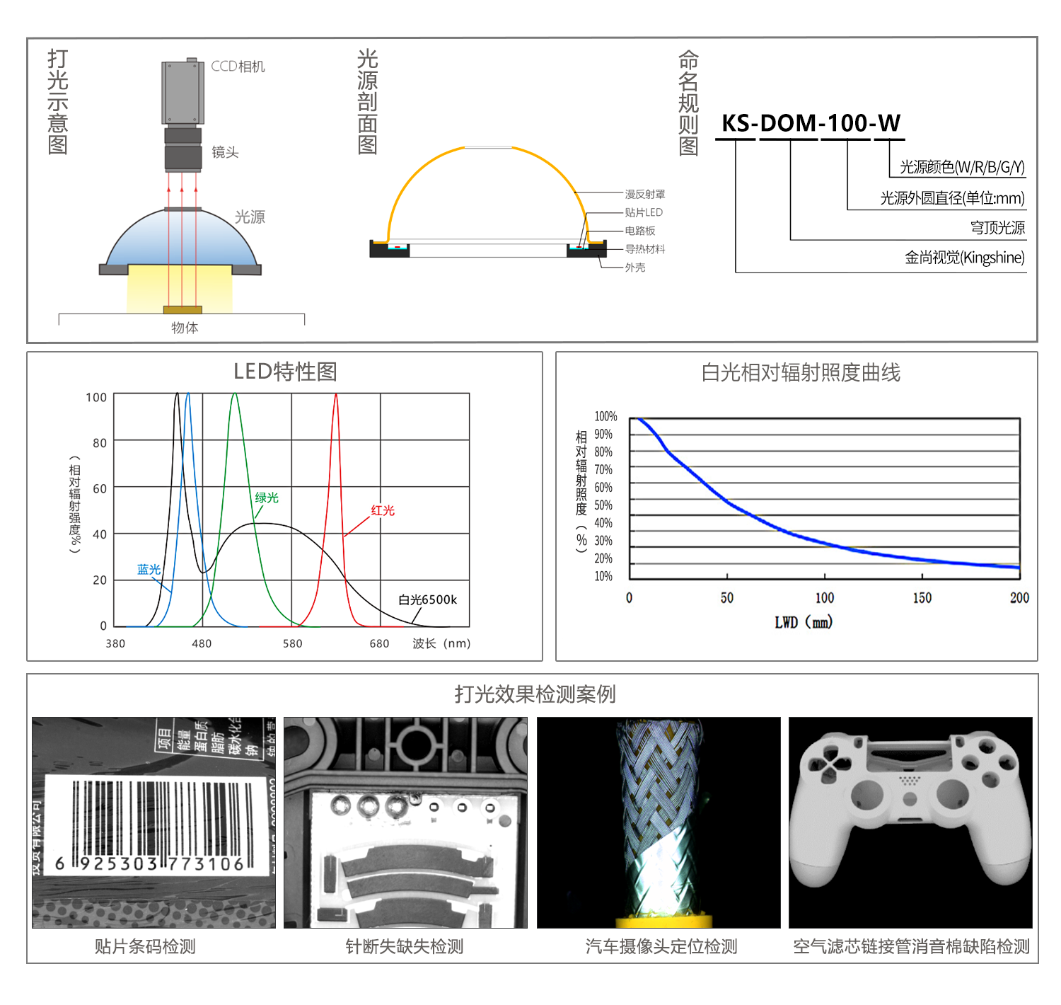 DOME系列碗光源,是由一圈高功率LRD往上照射,經過穹頂高表面的納米涂層漫反射之后,全方位均勻地照射在被測物體表面,擁有較大的光擴散面。